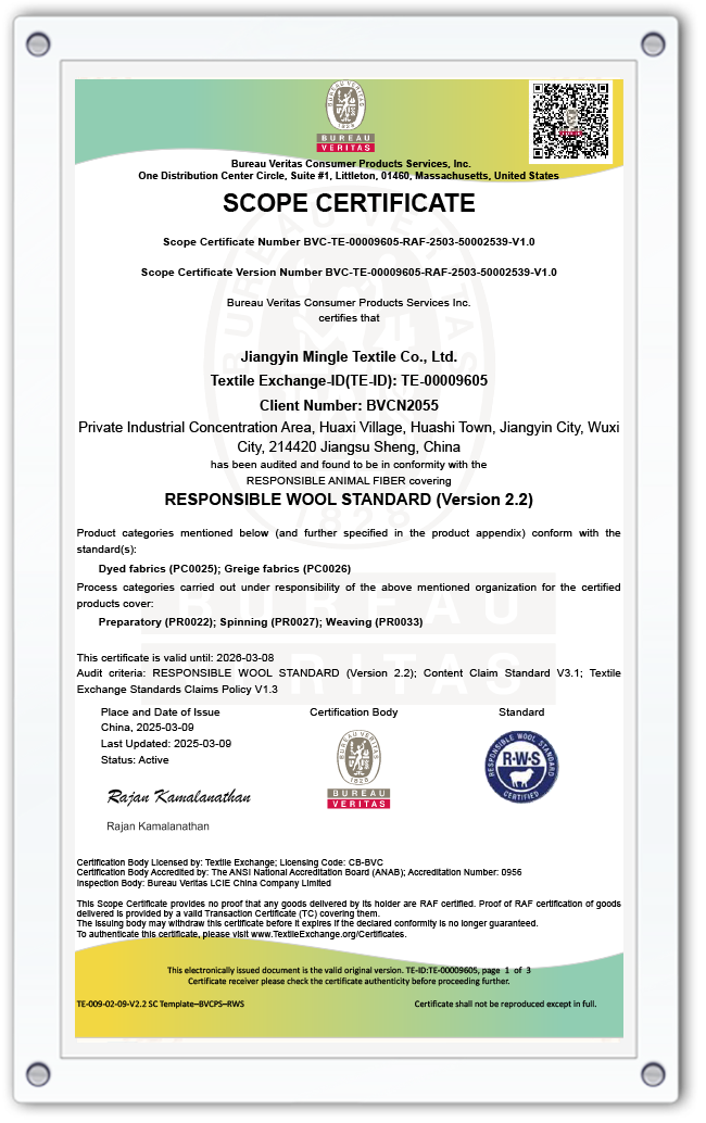 江阴市明格纺织有限公司成立于2006年10月,是一家专业的粗纺面料制造商,专门生产法兰绒、棉绒、光滑羊毛、各种双面羊毛和粗花呢。