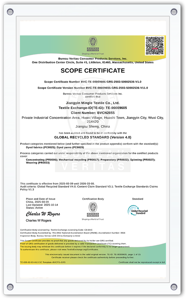 经过多年的专注研发,Mingle Textile已发展成为一家集再生纤维生产、纺纱、织布为一体的专业纺织企业。我们的产品出口到日本、韩国、欧洲和美国,并与H&M、ZARA、MANGO、CK、GAP等知名品牌合作。
